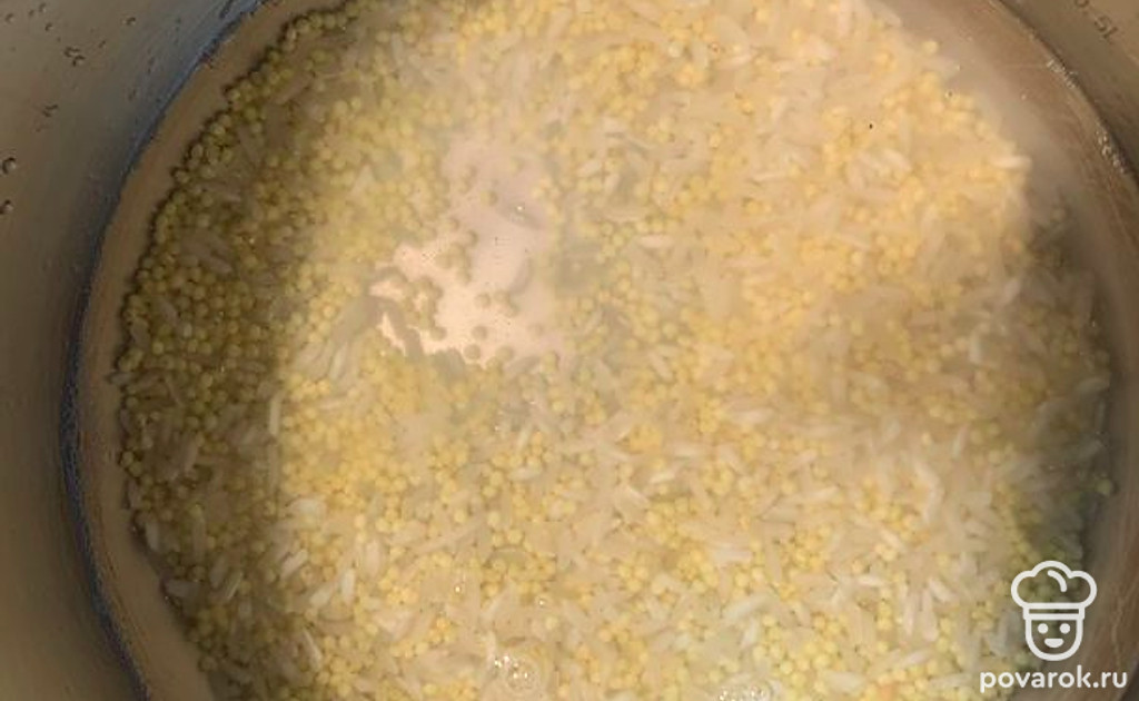 Пшено и рис хорошо промываем и отправляем в чашу. Заливаем водой в пропорции один к двум.
