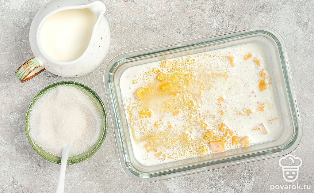 Приготовьте блюдо. В форму для запекания влейте молоко, добавьте сахар и аккуратно перемешайте. Запечатайте форму фольгой, а после поместите блюдо в духовку. Готовьте кашу с тыквой в течение 1 часа при температуре 200-220 градусов.