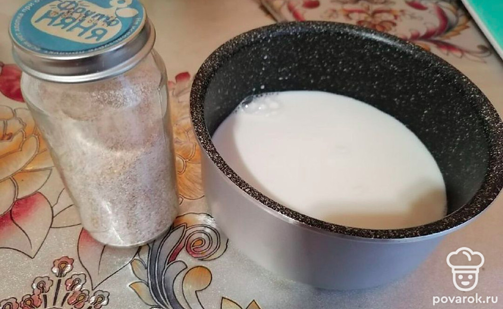 Подготовить ингредиенты, в кастрюлю влить молоко, кашу предварительно измельчить в кофемолке.
