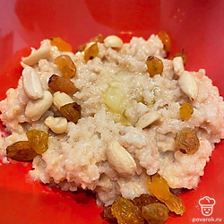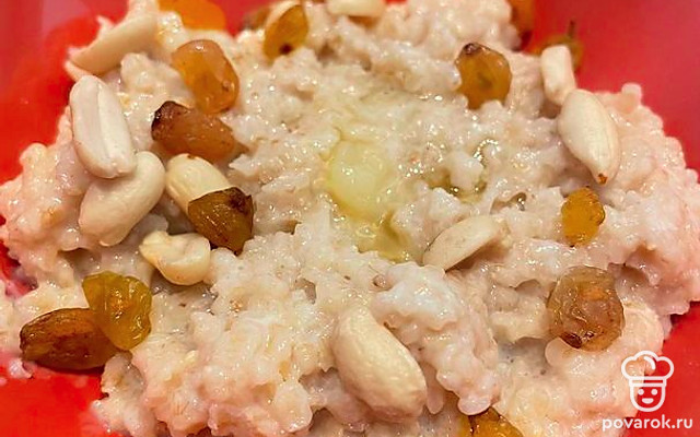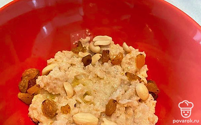 Выложите кашу на тарелку, добавьте масло гхи (порционно), изюм и орехи.
