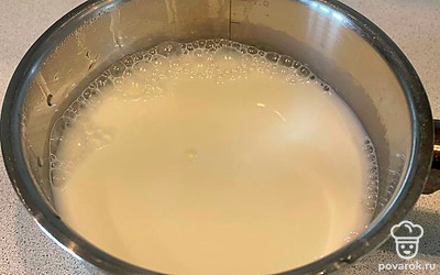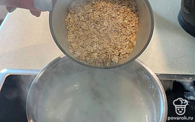 Поставьте на огонь и дождитесь, пока закипит. Убавьте газ и всыпьте хлопья.
