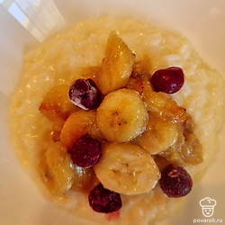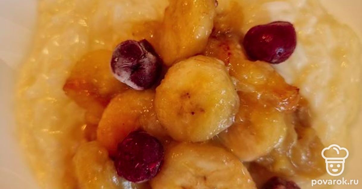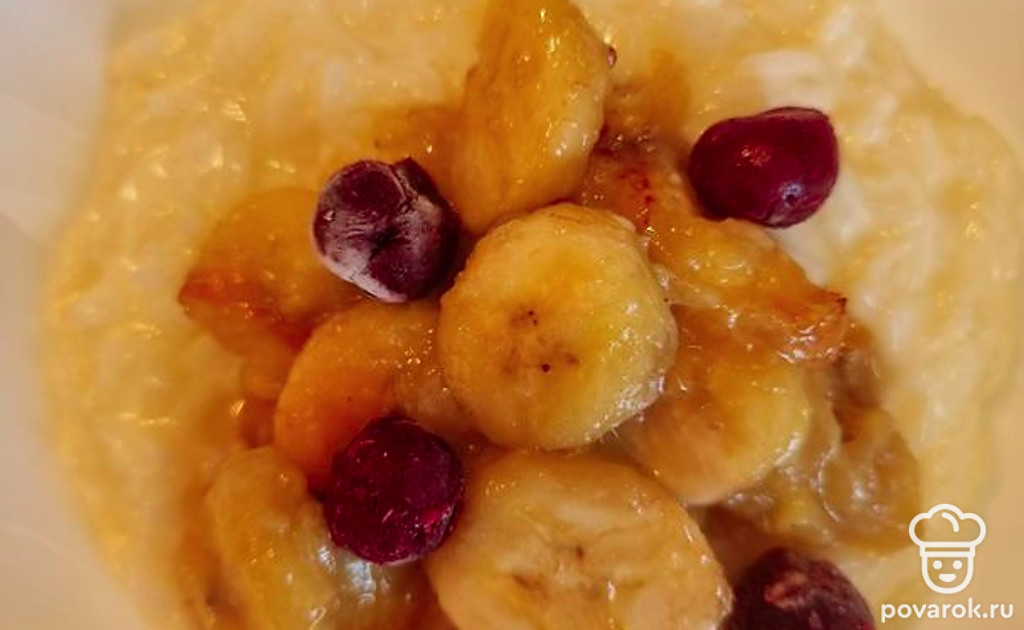 В горячую кашу вливаем взбитую смесь молока, яйца и сахара. Подаем кашу с бананами.