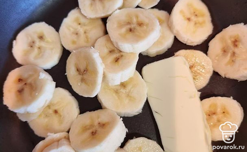 На разогретой сковороде плавим сливочное масло, добавляем 1 ст.л. сахара. Как только сахар начнется плавится, выкладываем дольки банана, жарим по 2 минуты с каждой стороны.