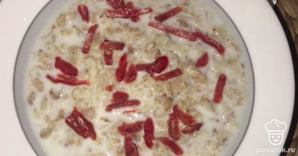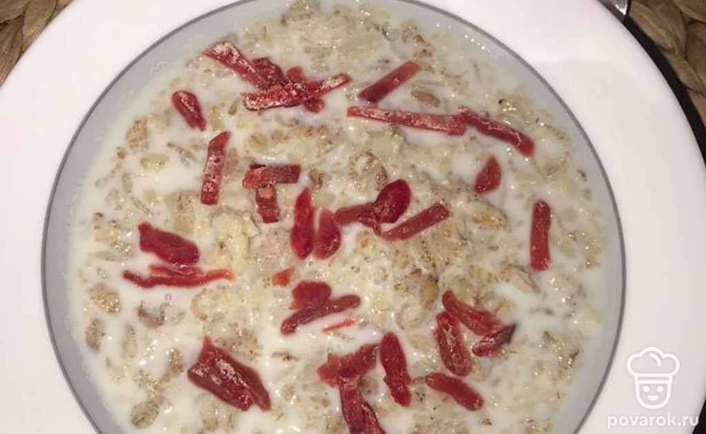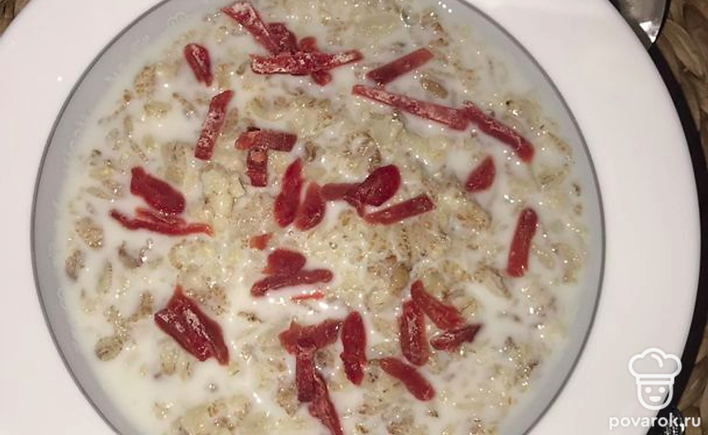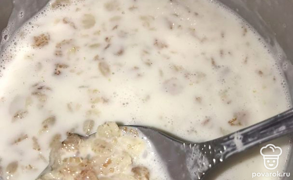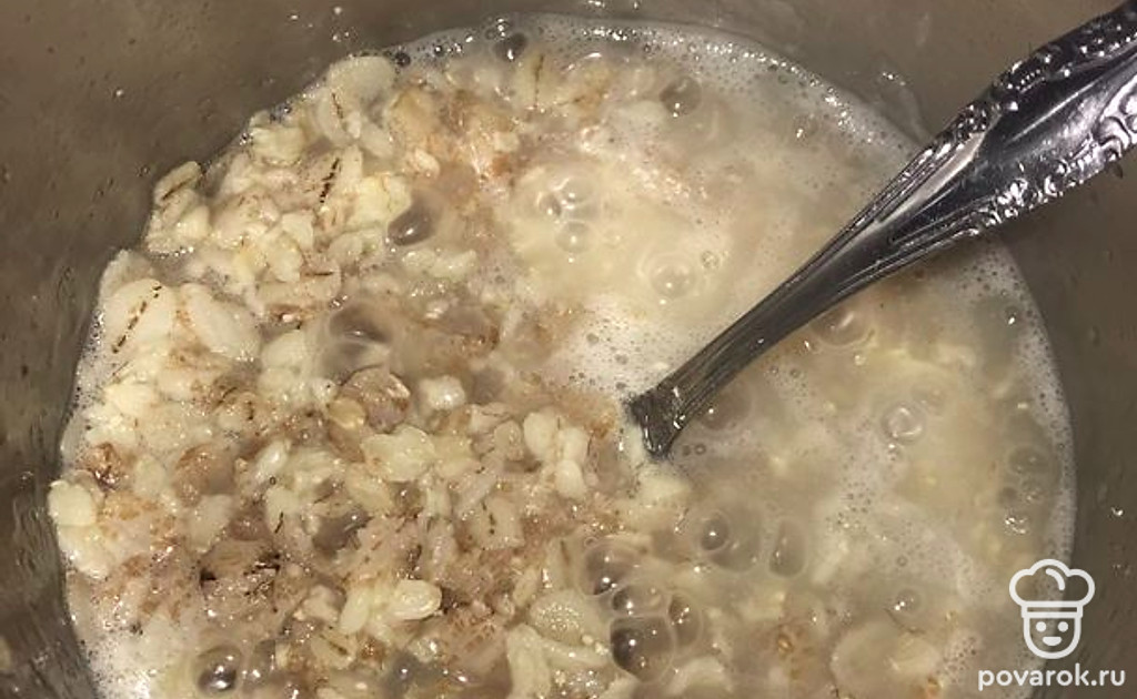 Добавляем 1 стакан молока, доводим до кипения и варим 5 минут, пока хлопья полностью не будут готовы.