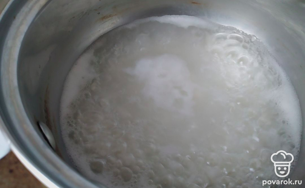 Промойте рис под проточной водой до тех пор, пока вода не станет прозрачной. Залейте рис питьевой водой и доведите до кипения. Посолите и варите 10 минут, пока не выпарится вода.