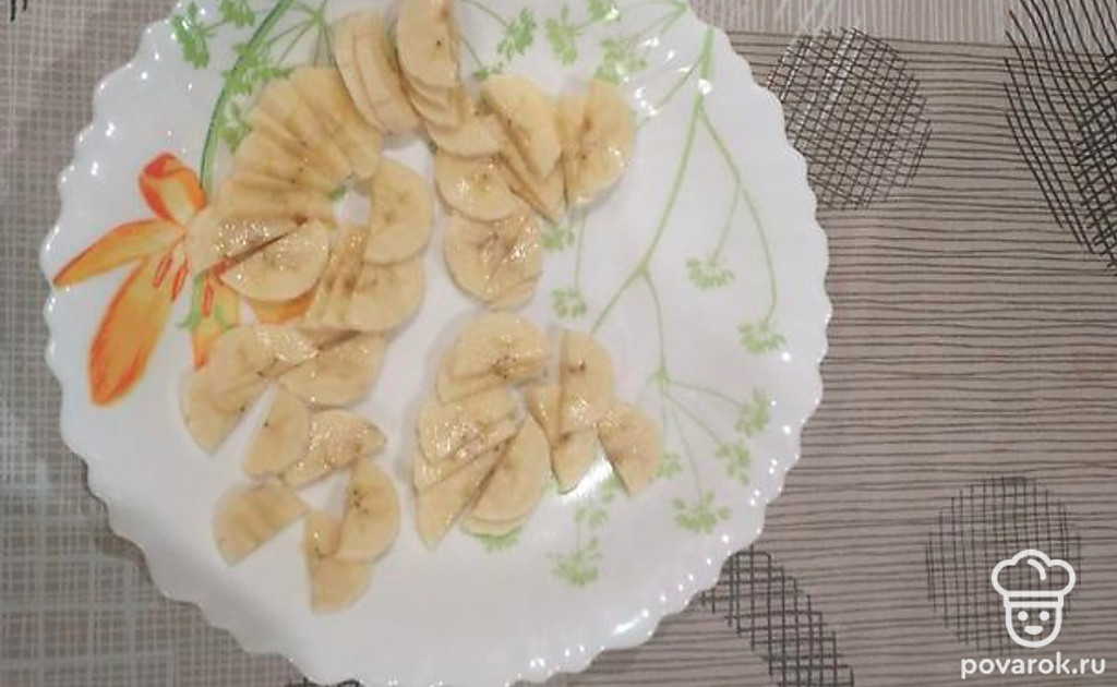 Банан нарежьте кружочками и добавьте в тарелку с кашей.