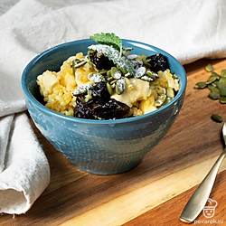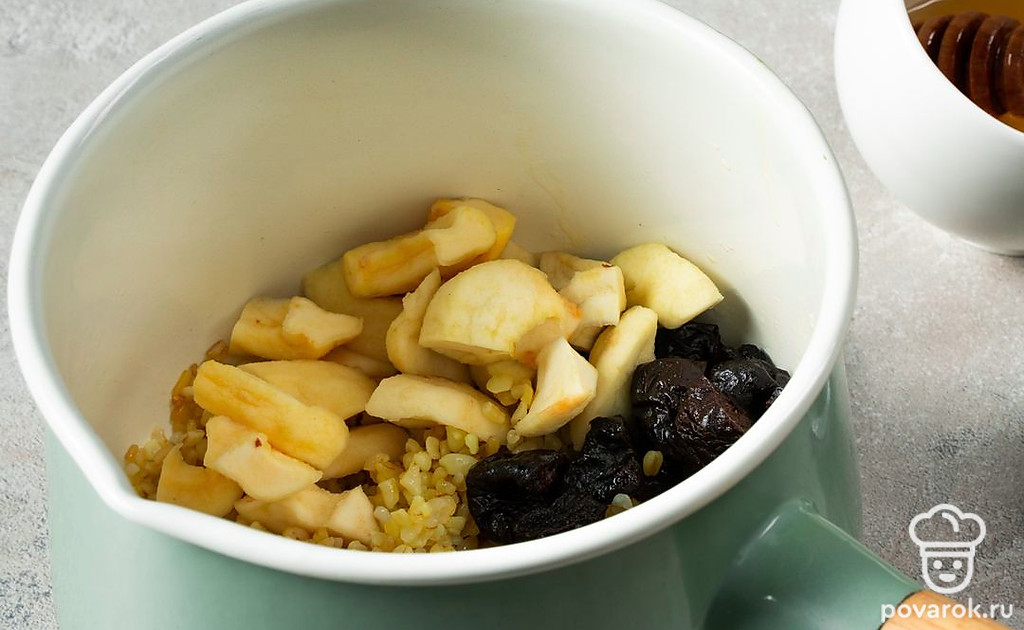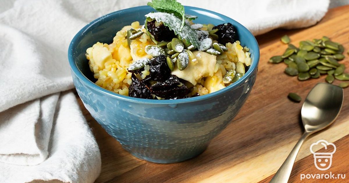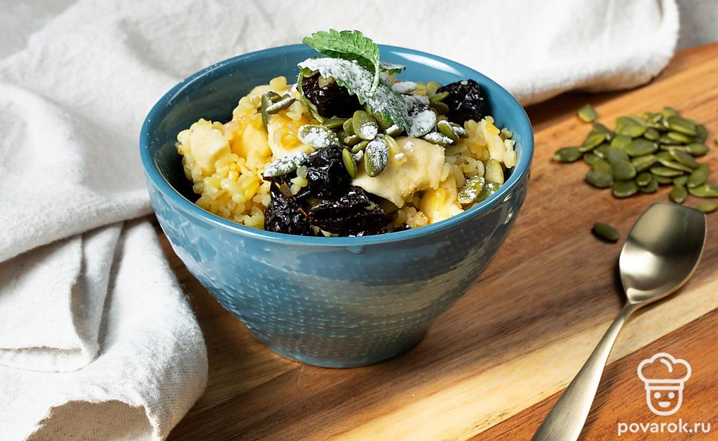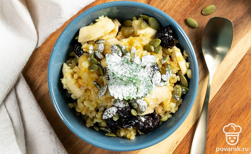 Каша из булгура с черносливом — лакомство, которое прекрасно подойдет на завтрак. Особенно вкусно получится, если дополнить его корицей. Чернослив можно заменить любыми другими сухофруктами по желанию. Булгур отличается невысоким гликемическим индексом и высоким содержанием витаминов и микроэлементов. Он благотворно воздействует на нервную систему, на состояние желчного пузыря и в целом на организм. Противопоказанием является индивидуальная непереносимость глютена.