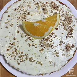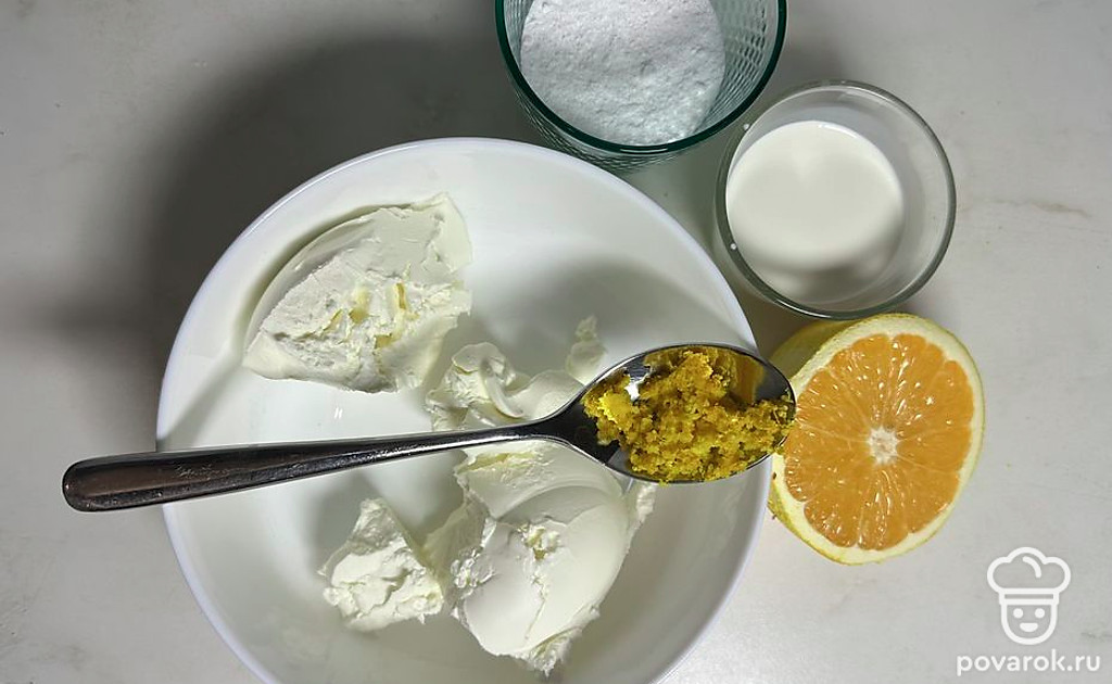 Пока выпекается кекс, приготовить фростинг: соединить в миске сливочный сыр, сливки, сахарную пудру, сок и цедру апельсина. Взбить миксером и нанести на остывший кекс.