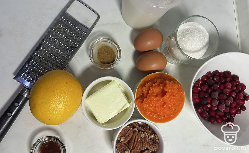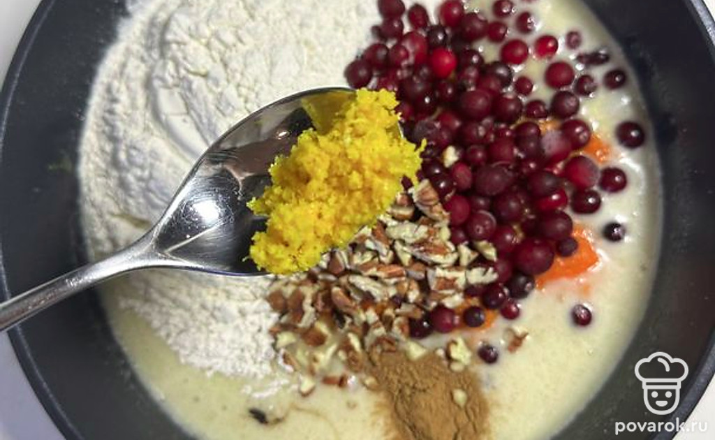Добавить оставшиеся ингредиенты для теста: муку с разрыхлителем, соль, цедру апельсина, морковное пюре, ванильный экстракт (по желанию), специи, клюкву, а также орехи макадамия или грецкие, предварительно мелко нарезанные.