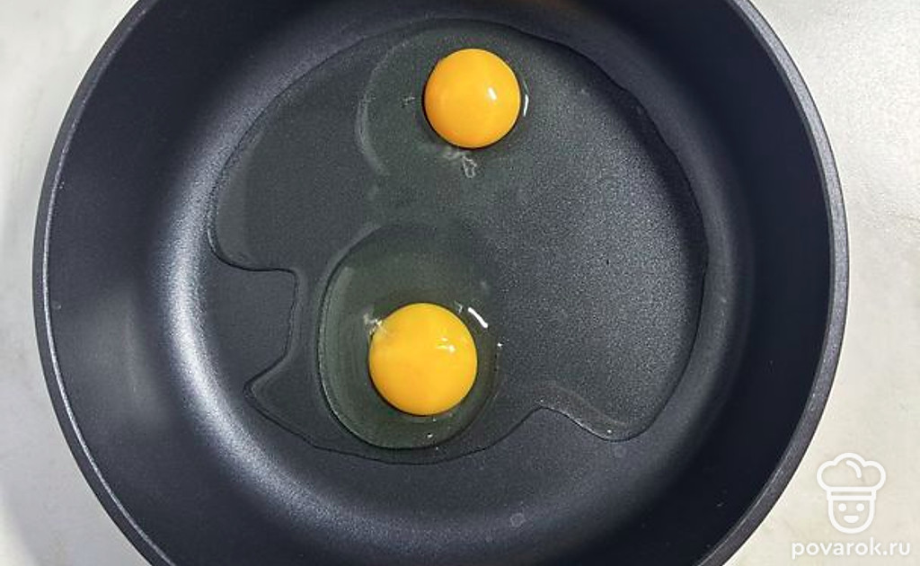 Прямо в сковороду разбить два яйца.