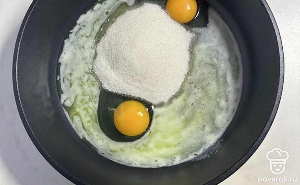 Добавить сахар и растопленное сливочное масло. Перемешать.