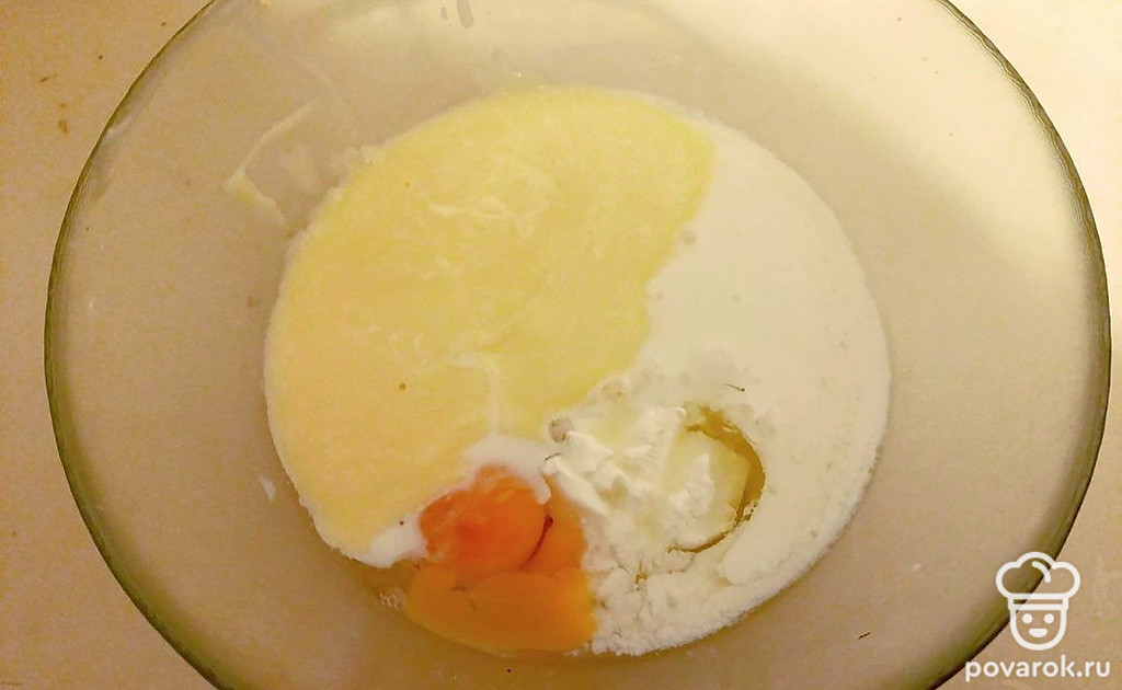 В другой миске взбейте лопаткой до однородности все жидкие ингредиенты: яйца, молоко, сметану, мягкий маргарин.