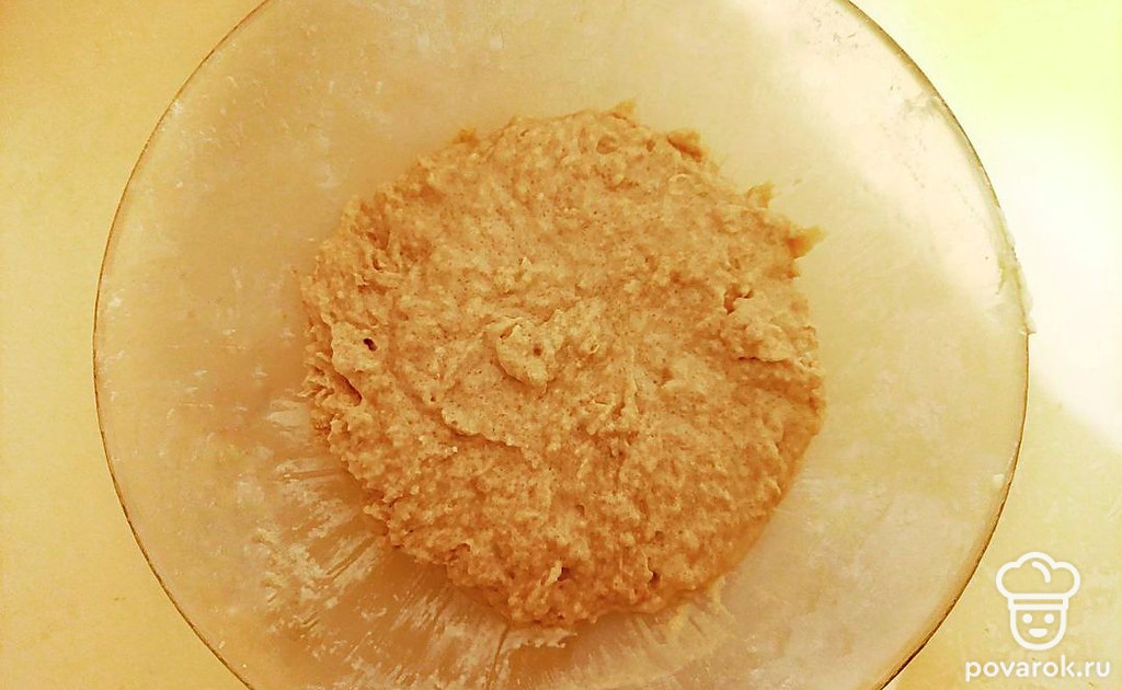 Подмешайте жидкую часть теста к сухой и размешайте до однородности. Получится густое тесто.