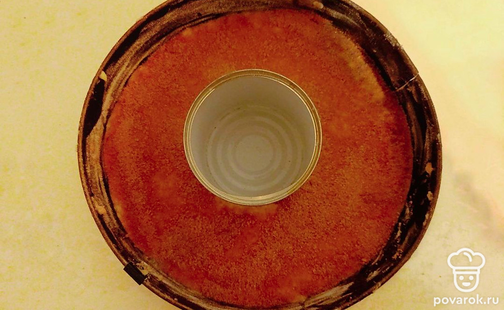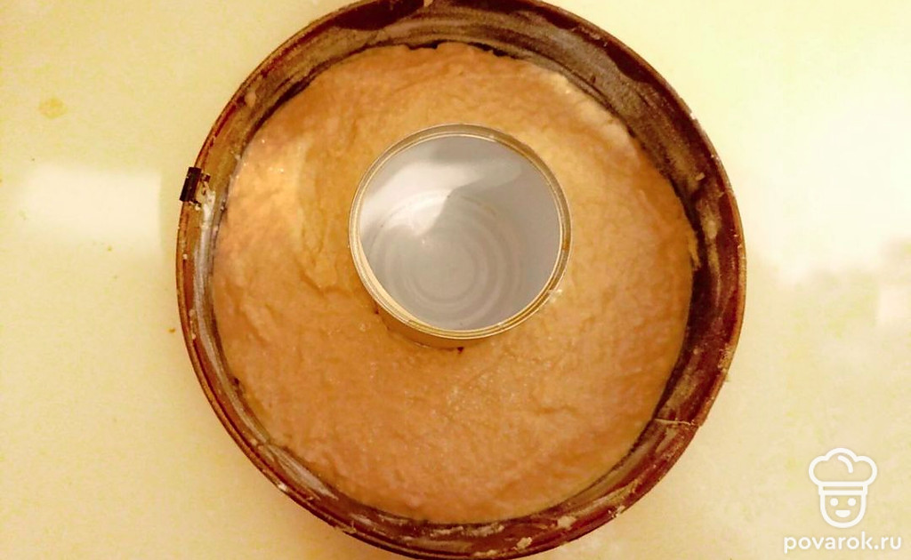 В форме, лучше круглую, 18-20 сантиметров в диаметре, сделать французскую рубашку: смажьте стенки формы сливочным маслом, присыпьте мукой. Остатки муки удалите. Равномерно выложите тесто.