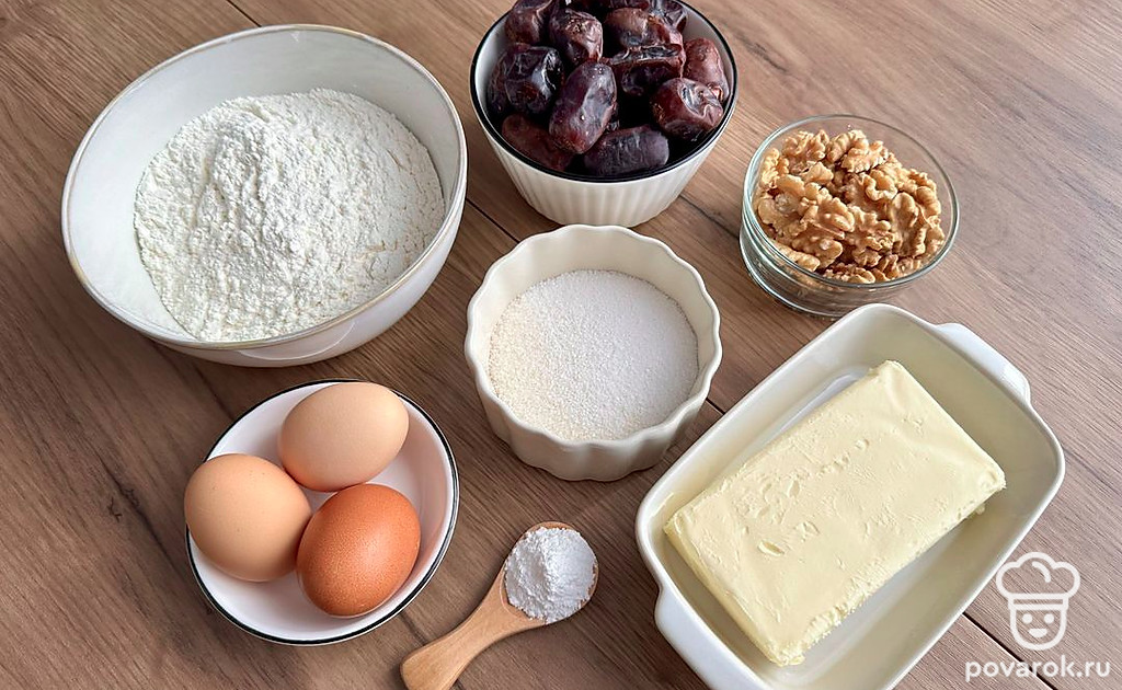 Подготовьте все ингредиенты. Возьмите масло и яйца комнатной температуры. Яйца у меня очень мелкие. Если у вас первый сорт, можно взять 2 яйца. Финики берите мягкие.
