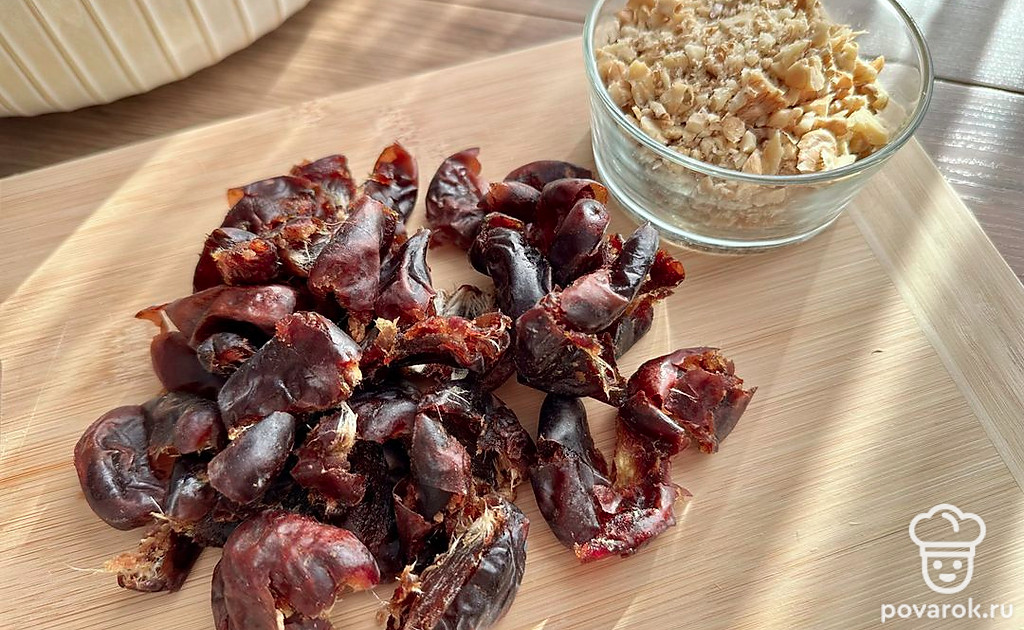 Грецкие орехи порубите ножом на крупные кусочки, из фиников достаньте косточку, разделите их на пару частей.