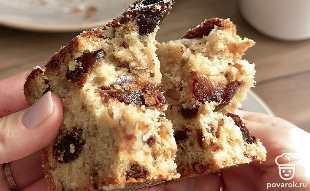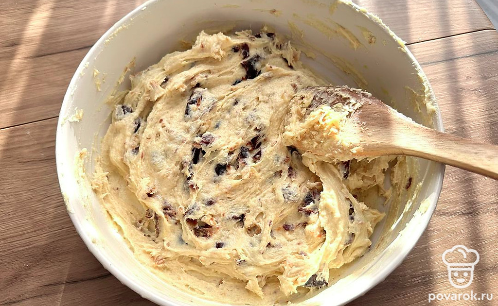 Добавьте финики и орехи в тесто, аккуратно вмешайте лопаткой.
