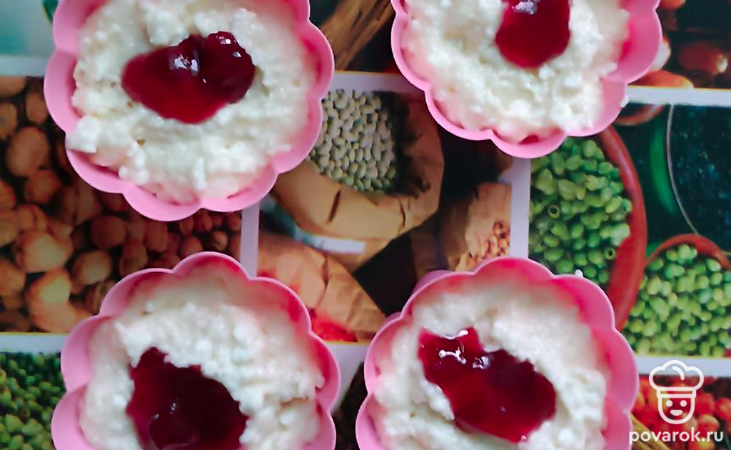 Выложить тесто в формы на 1/3, добавить в каждую немного джема.