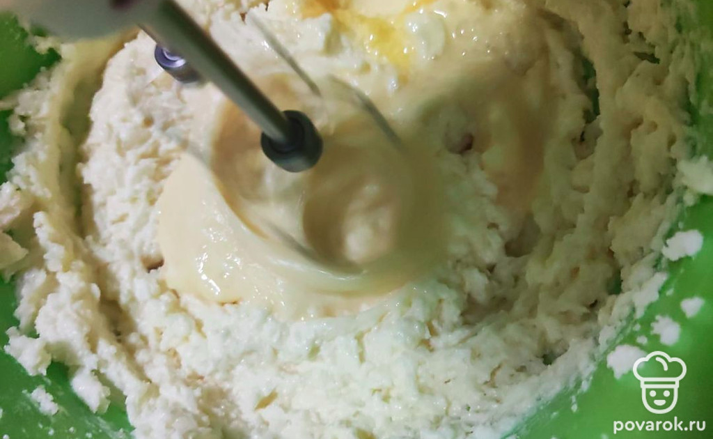 Взбейте мягкое масло с сахаром и ванильным сахаром до однородной массы. В массу вбейте поочередно яйца, хорошо взбивая после каждого. Всыпьте просеянную муку и хорошо перемешайте до исчезновения комочков. Тесто должно получиться вязким.