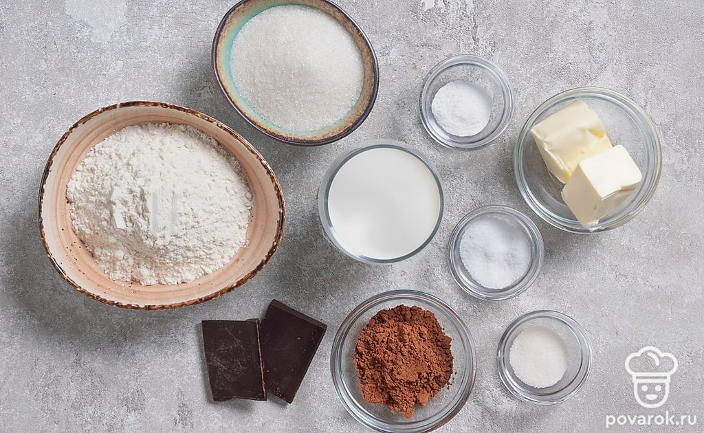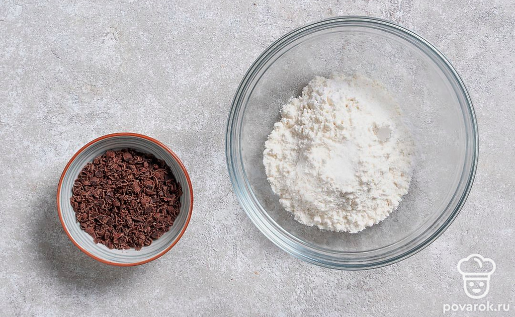 Натрите ломтики шоколада на средней терке. Смешайте муку с разрыхлителем и солью.