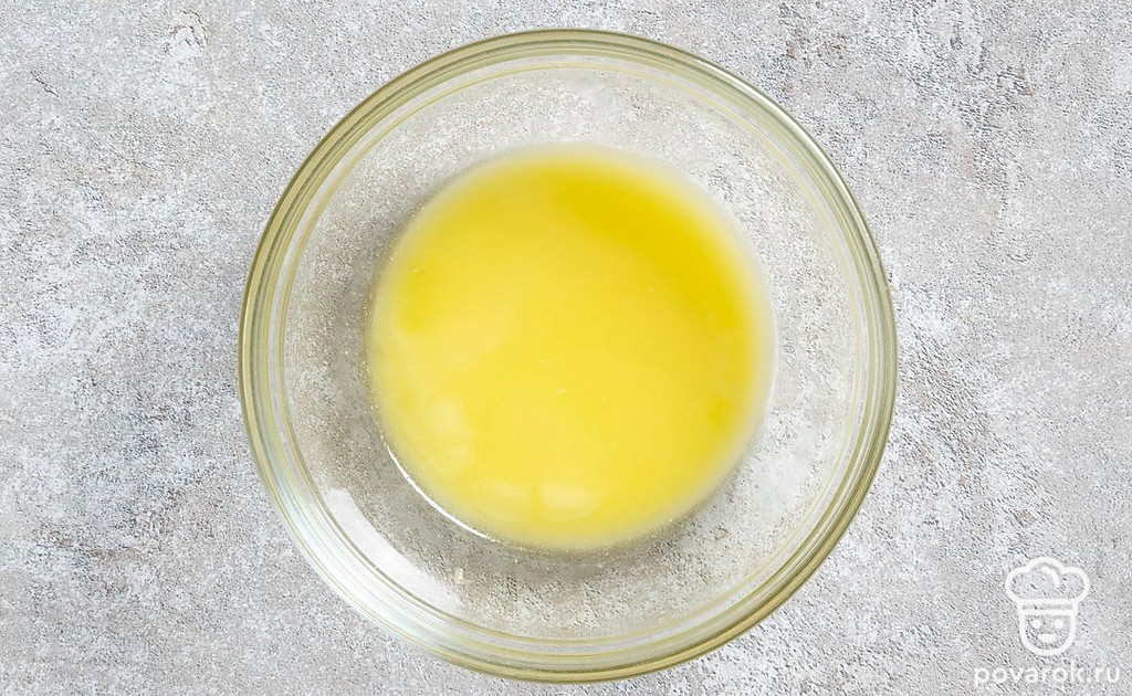 Выложите в глубокую миску сливочное масло. Поставьте растапливаться в микроволновку на среднюю мощность 10-15 секунд.