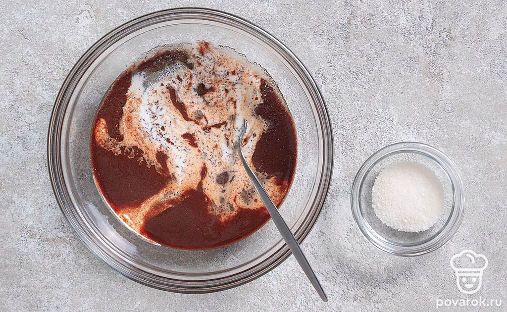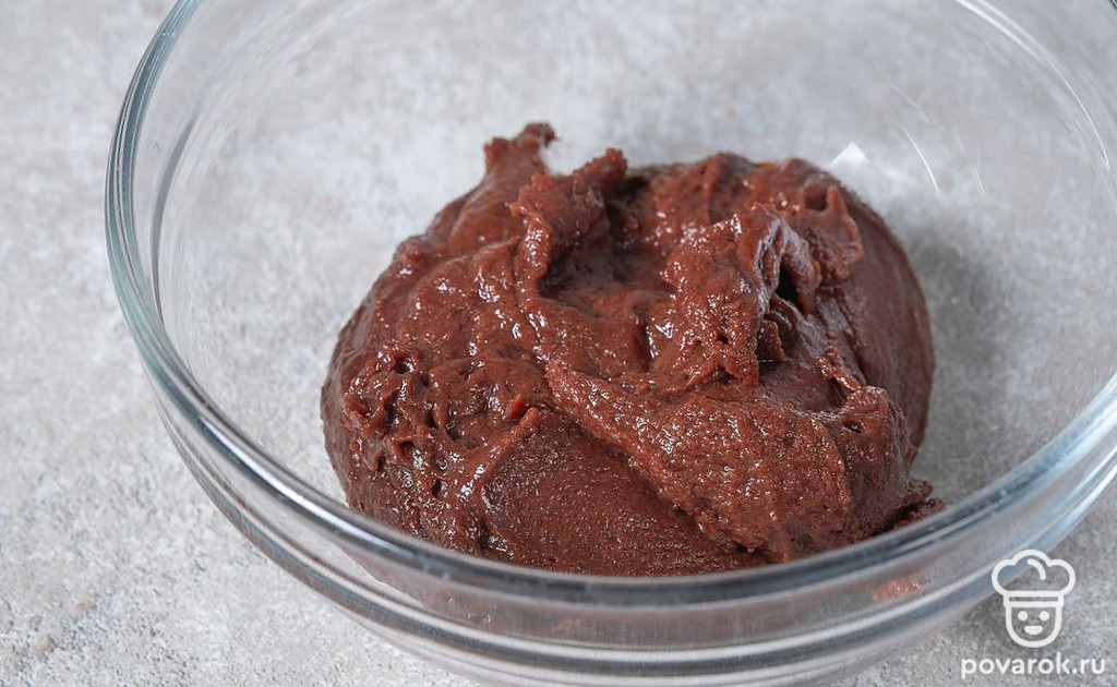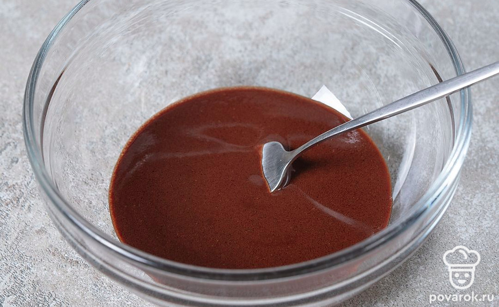 Достаньте из микроволновки растопленное масло. Всыпьте в него какао-порошок, а затем хорошо перемешайте массу.