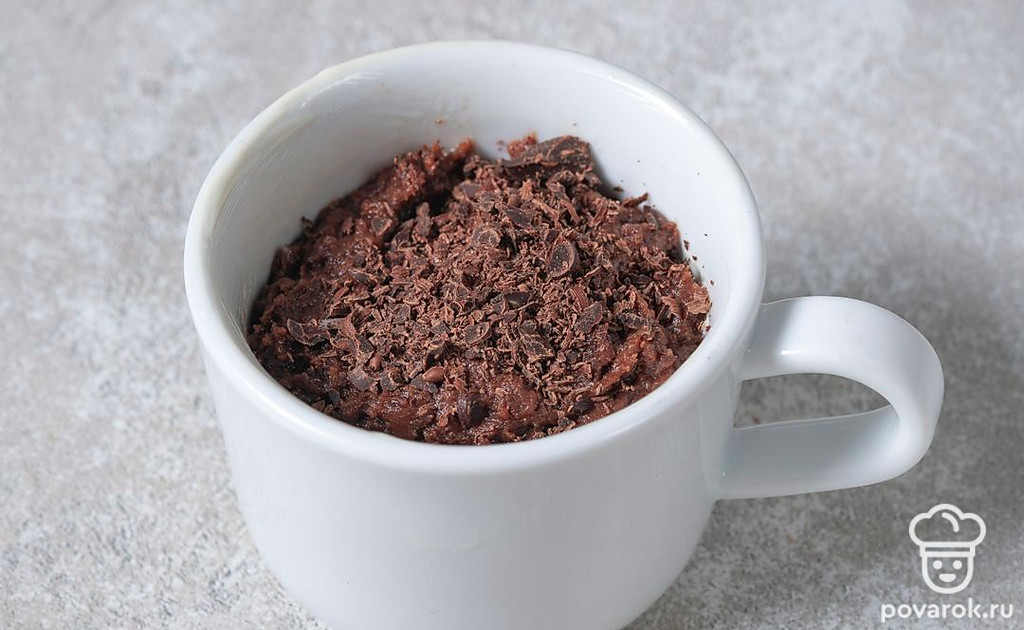 Переложите тесто в кружку, сверху посыпьте его шоколадом. Кружка должна быть заполнена на две трети, чтобы тесто не вывалилось в процессе выпекания.
