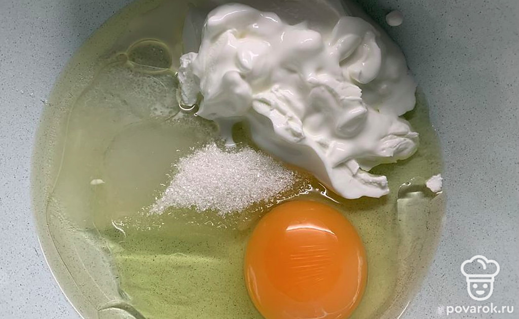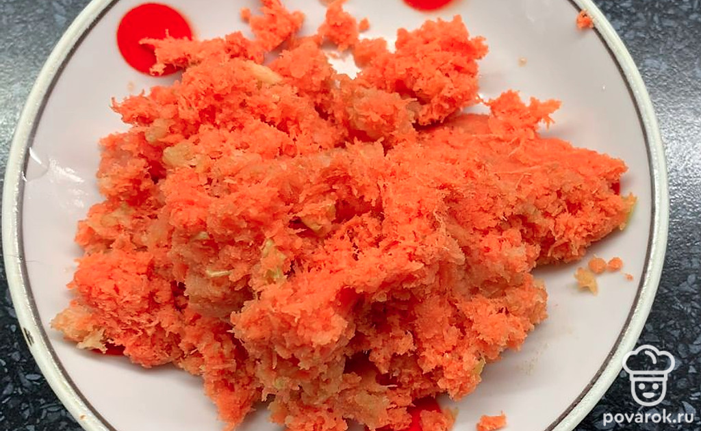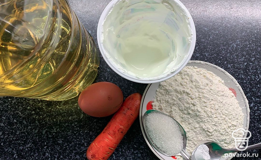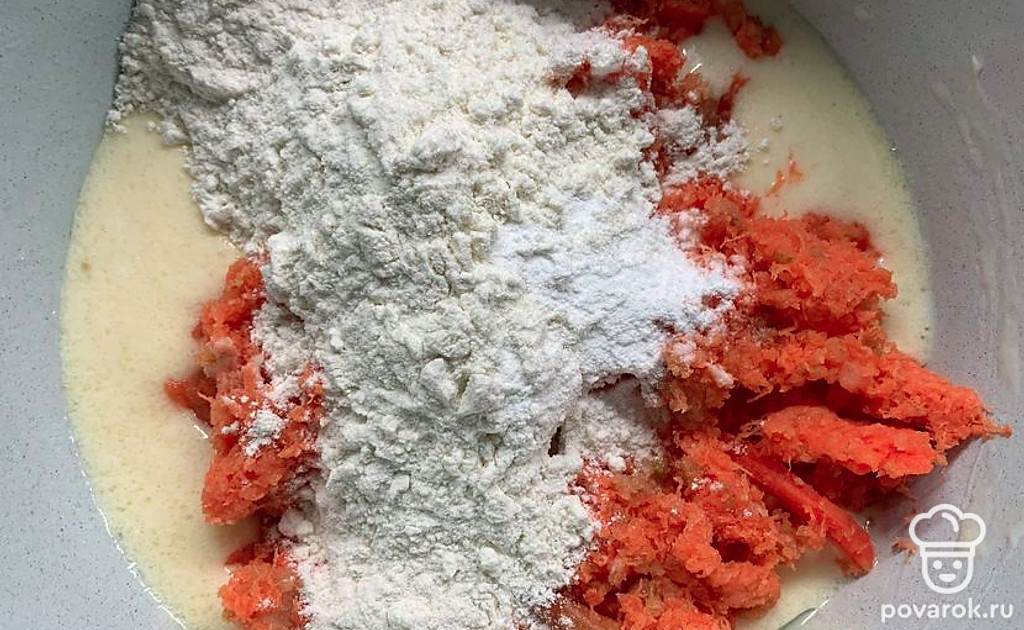 Добавить морковку, муку, подсолнечное масло и разрыхлитель. Перемешать.