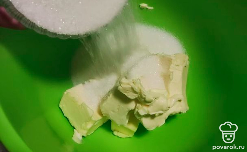 В миске миксером взбейте мягкое масло с сахаром и ванильным сахаром до однородной массы. В массу вбейте поочередно яйца, хорошо взбивая после каждого.