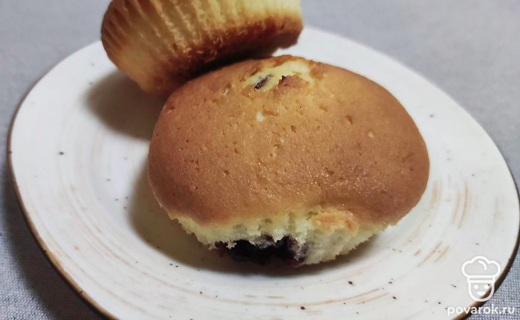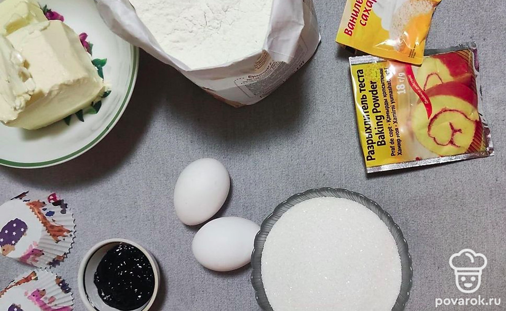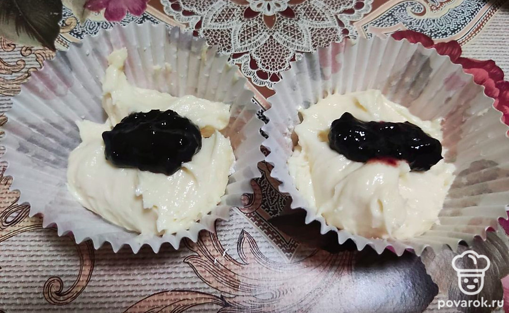 Выложите тесто в формочки на 2/3, добавьте чайную ложку варенья. Сверху выложите тесто. Отправьте в духовку на 20-25 минут.