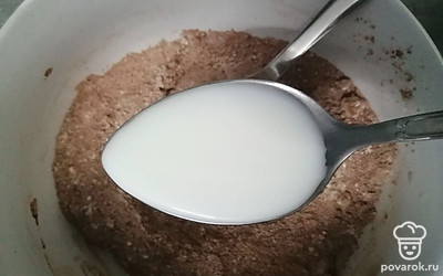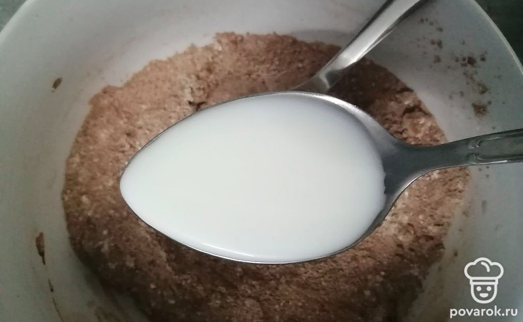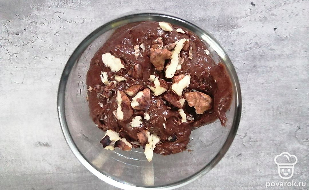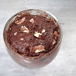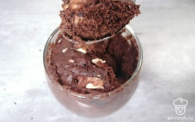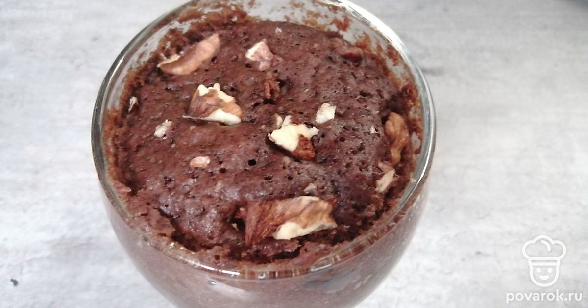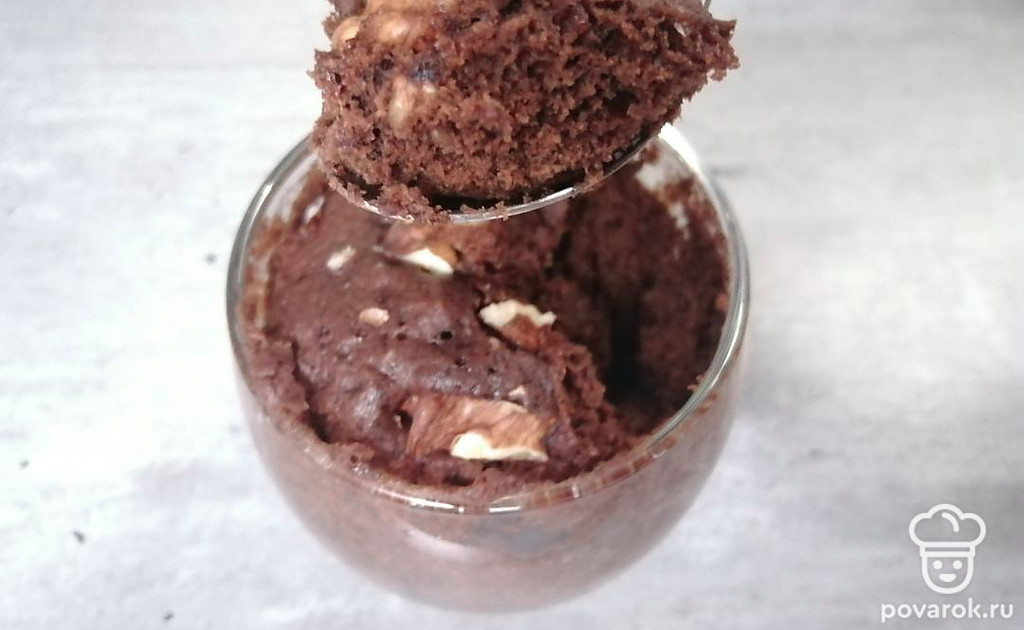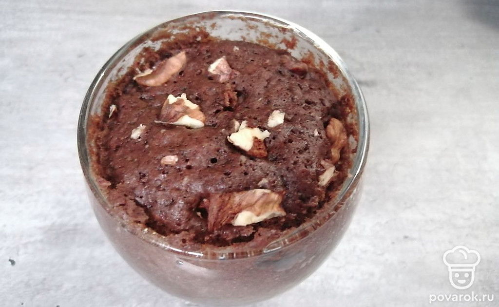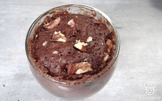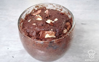 Выкладываем тесто в стакан. Сверху посыпаем орешками. Ставим в микроволновую печь на 5 минут.