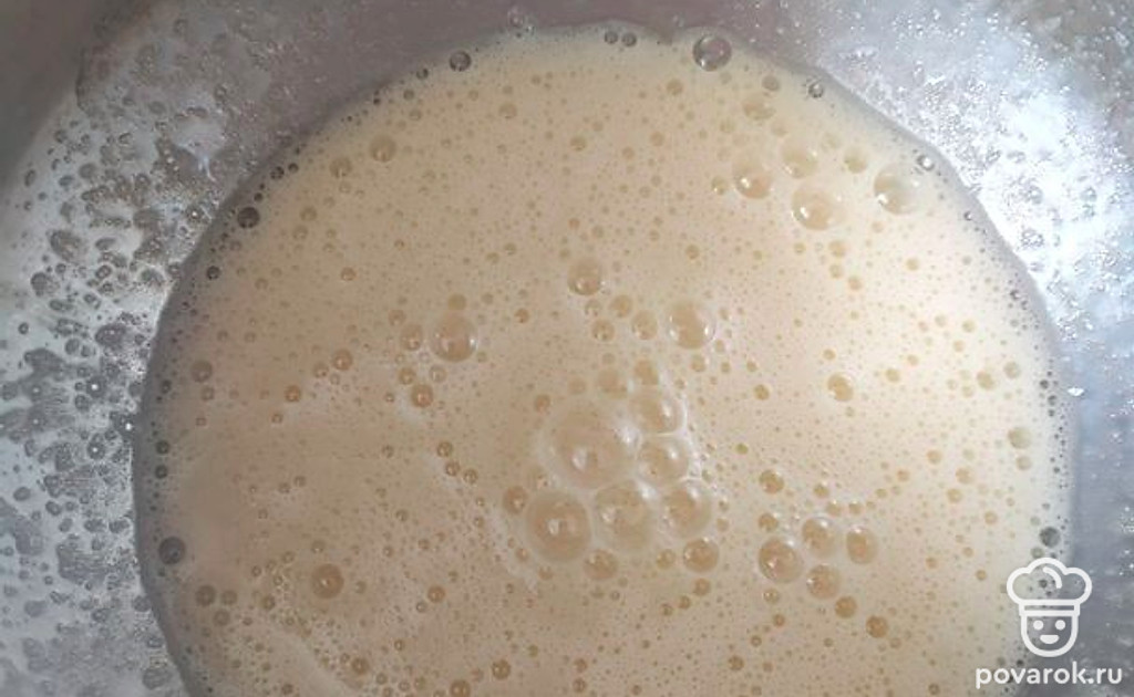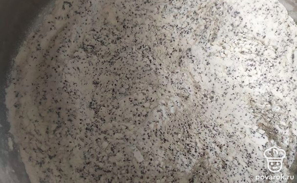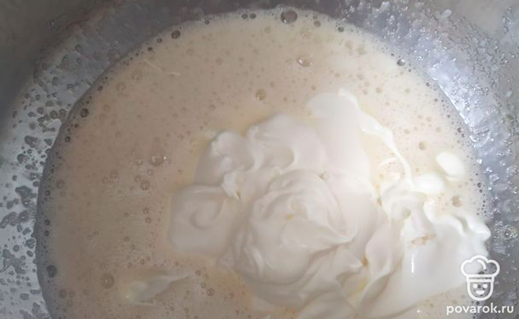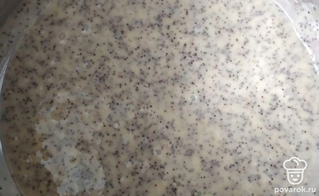 Смешать все вместе. Тесто должно получиться жидкое и стекать с ложки.