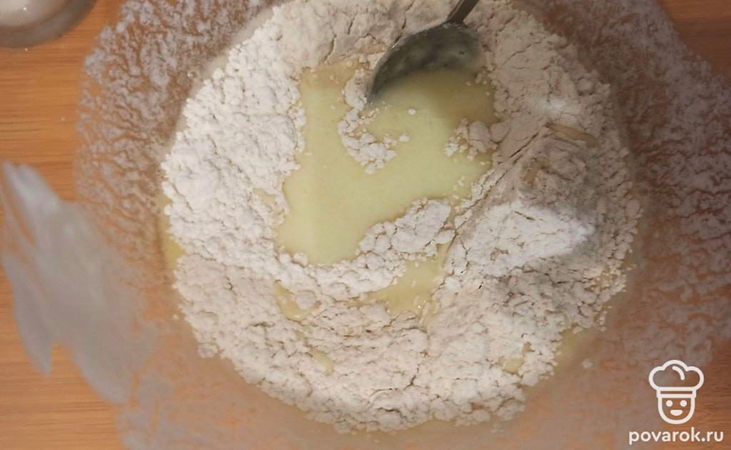 Добавьте муку, масло и разрыхлитель. Хорошо перемешайте до однородной массы.