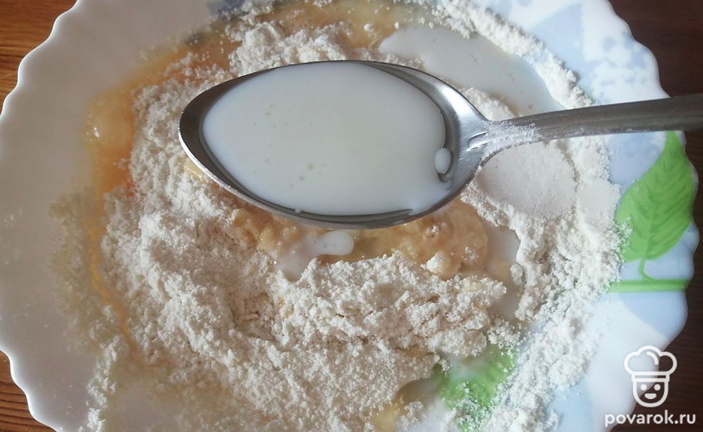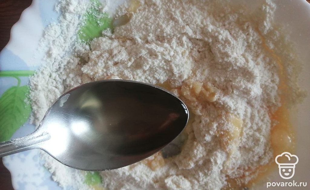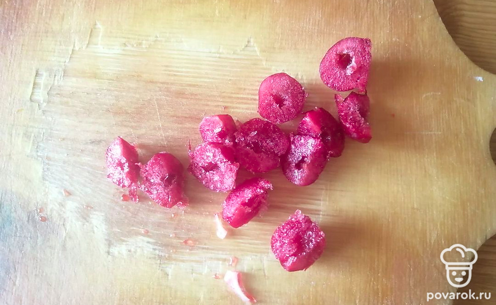 Вишню разрезать на небольшие кусочки. Добавить к тесту.