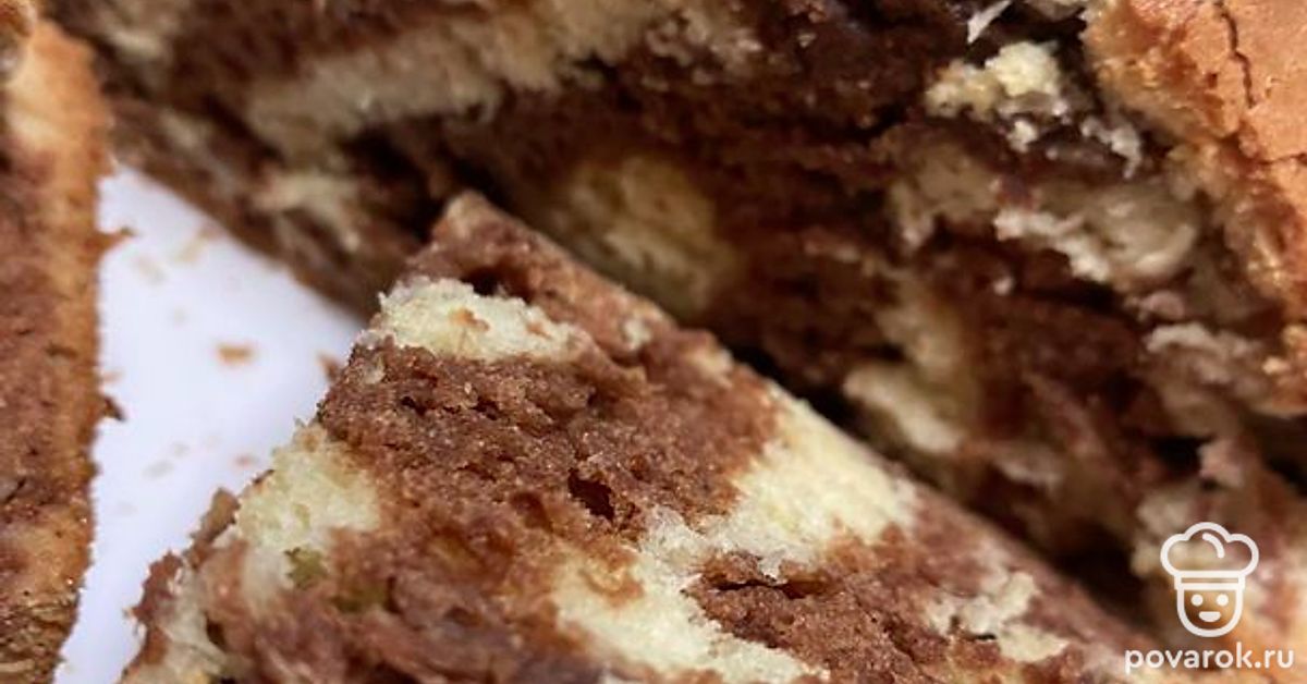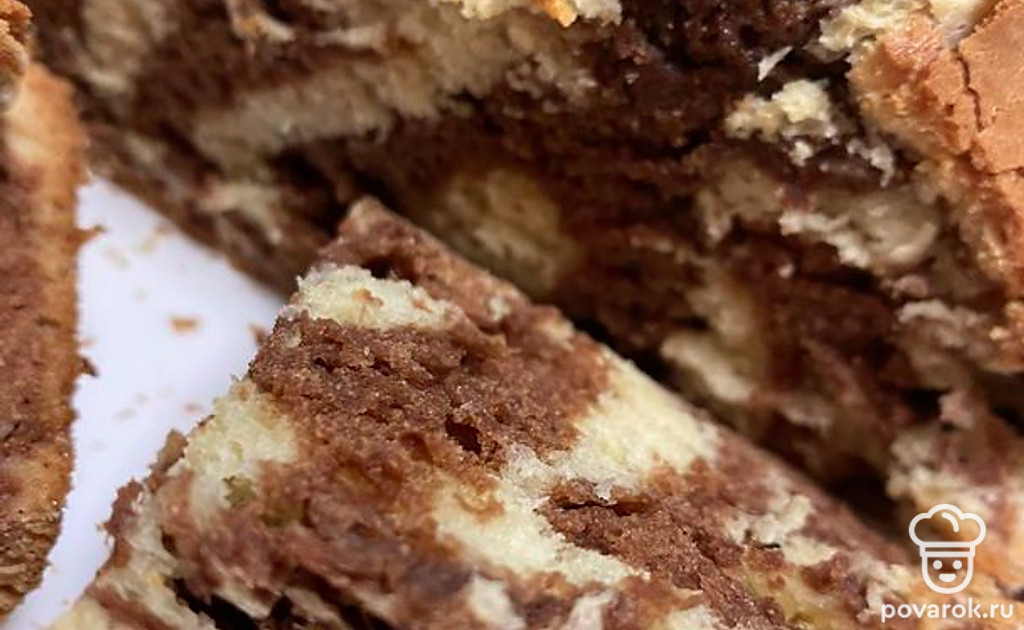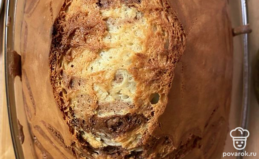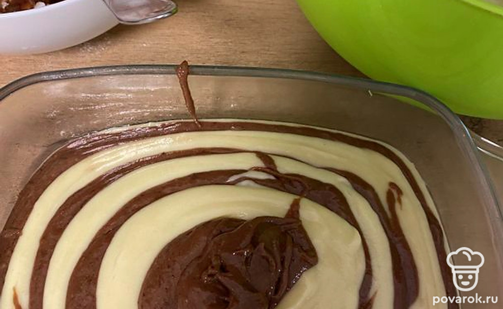 В предварительно смазанную небольшим количеством масла форму переливайте тесто. Поочередно. Сначала 2 ложки одного теста, затем 2 ложки другого.
