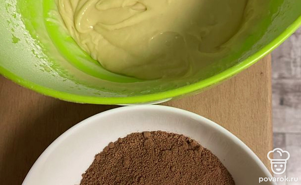 Половину полученной смеси перелейте в другую емкость и добавьте какао.
