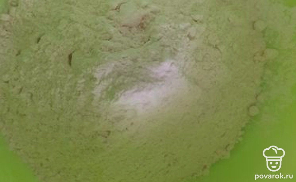 Муку нужно просеять, добавить разрыхлитель и перемешать.