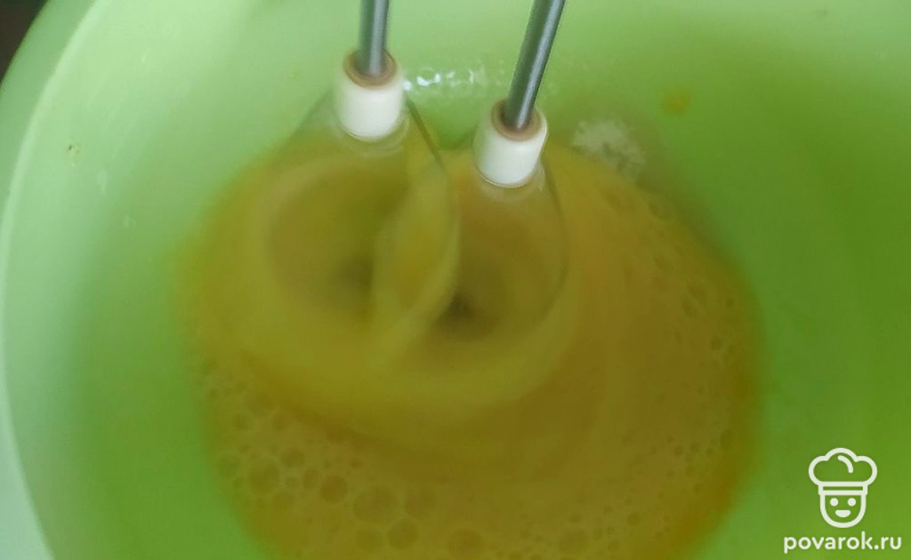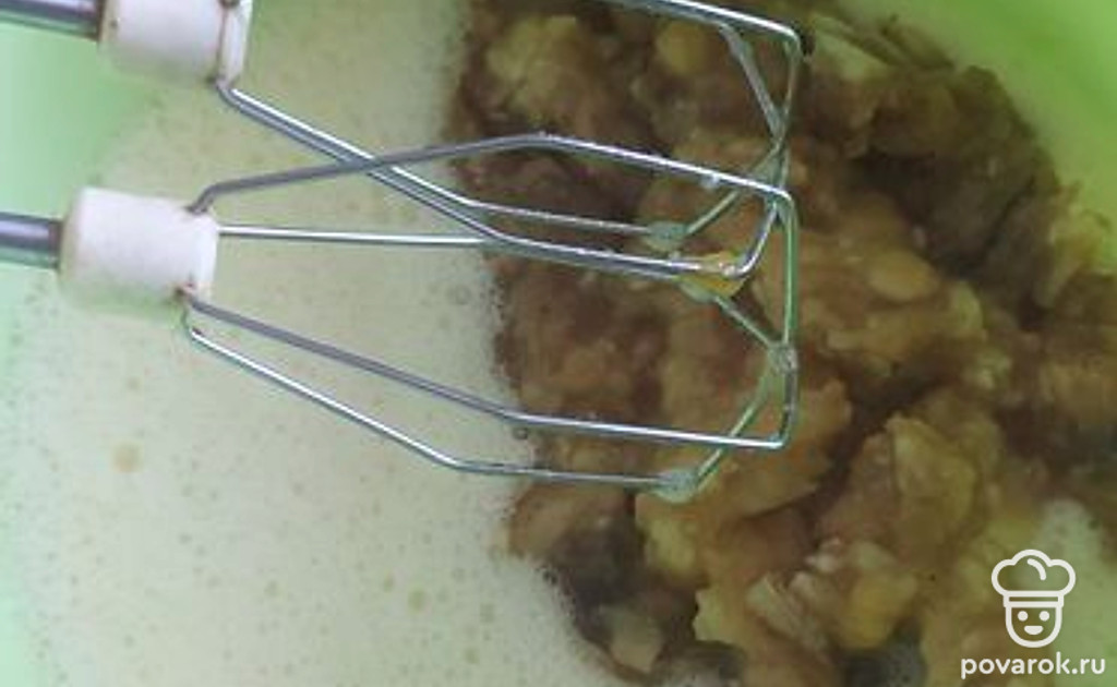 К взбитым яйцам добавить банановую массу, перемешать, удобнее с помощью миксера.