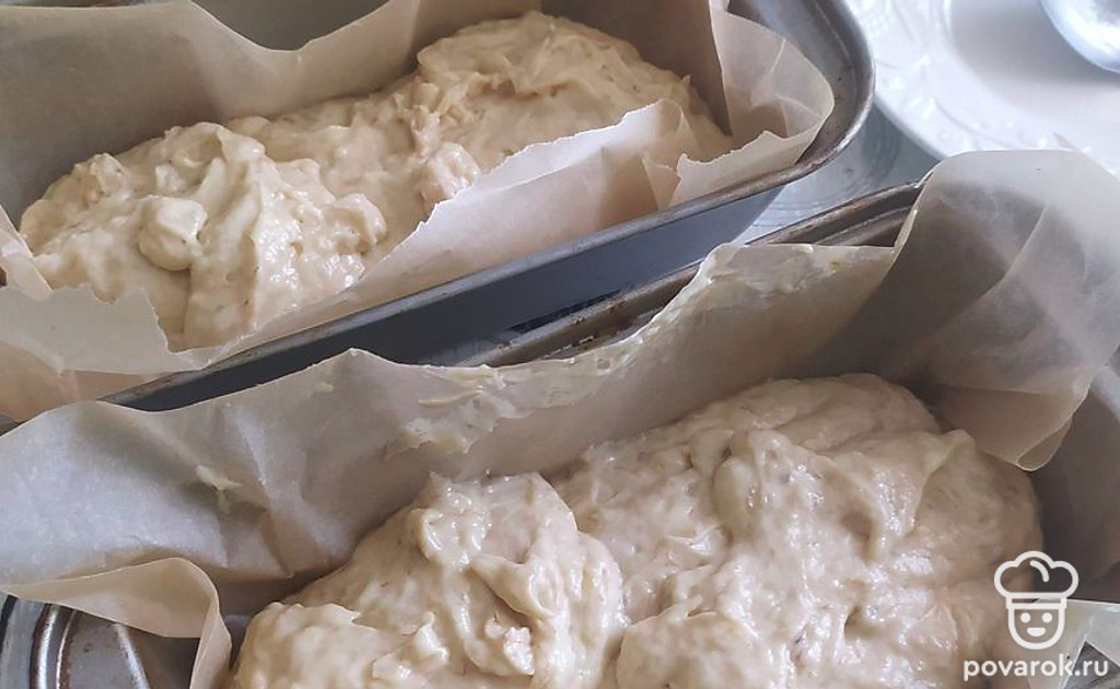 Выложить массу в форму, у меня их две, и застелить дно формочек пекарской бумагой.