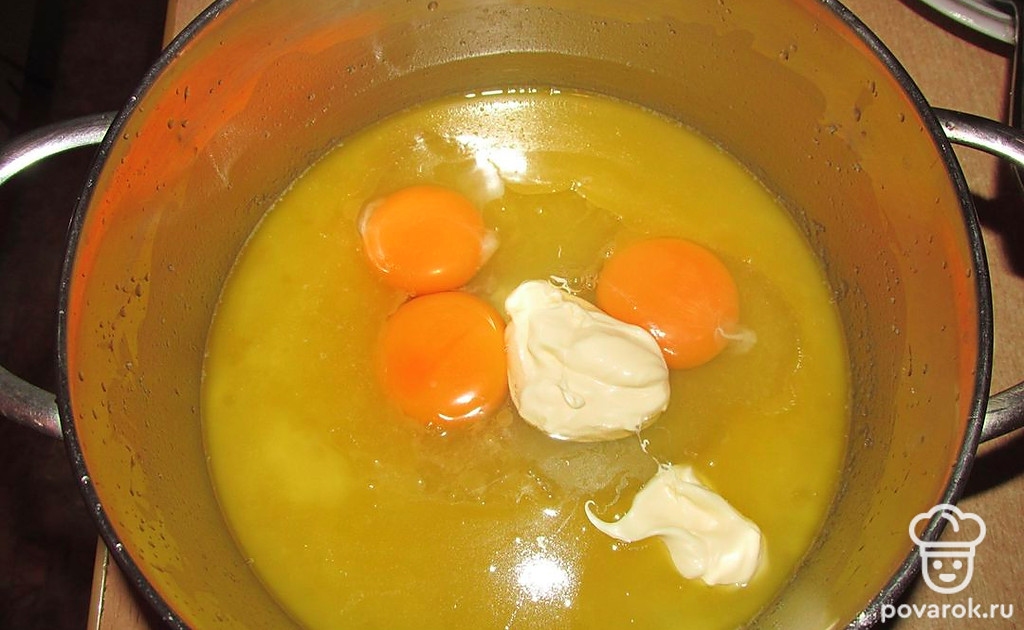 Сливочное масло растопите, добавьте сахар, яйца, майонез и хорошо перемешайте.