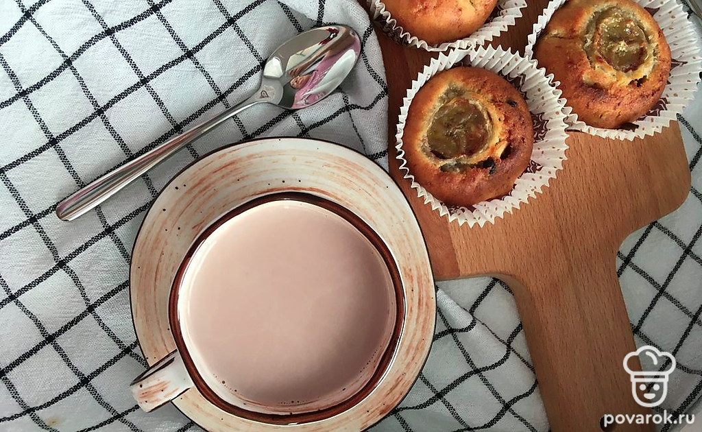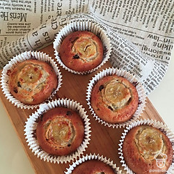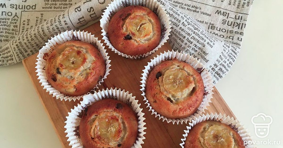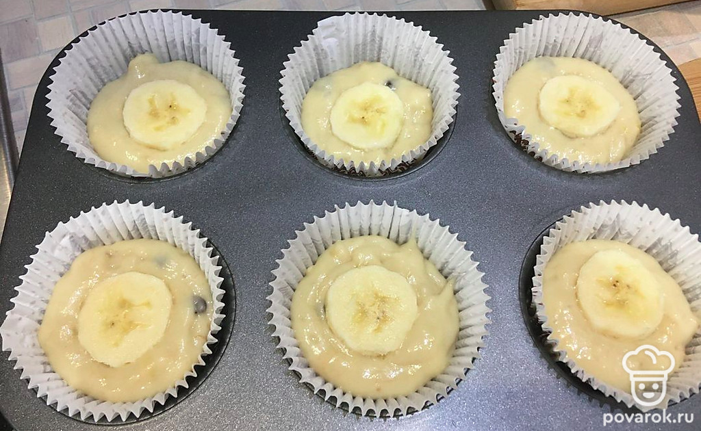 Заполнить формы для кексов получившимся тестом на 2/3. Сверху положить кружочки банана. Выпекать до золотистого цвета при температуре 200 градусов около 25 минут. Готовность проверить шпажкой (она должна выходить сухой).