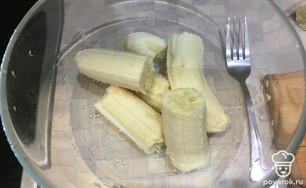 Размять почти все бананы вилкой. Половину банана отложить в сторону.