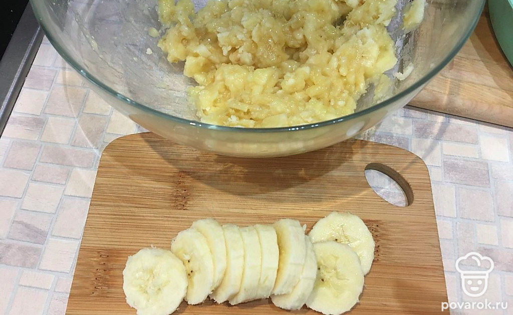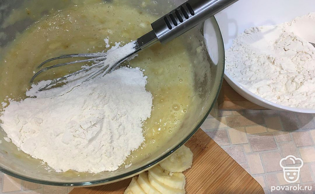 Отложенную половинку банана нарезать кружочками. Муку с разрыхлителем смешать.