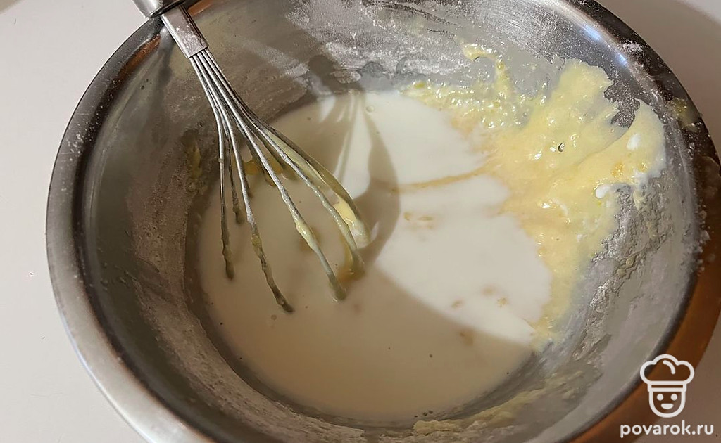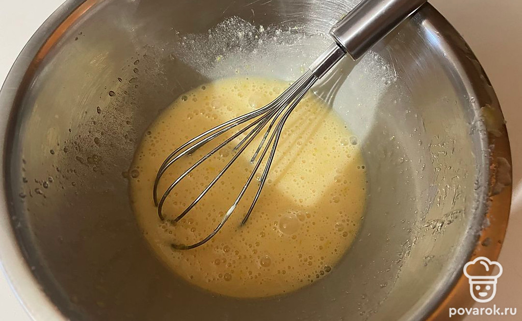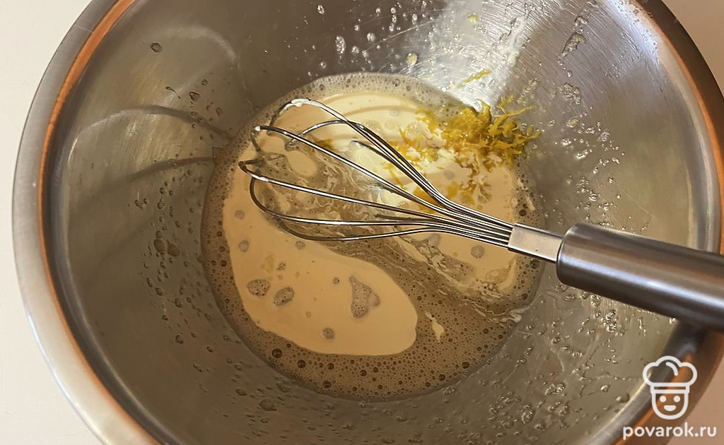В емкости соедините яйца, сахар, растопленный маргарин и цедру лимона.