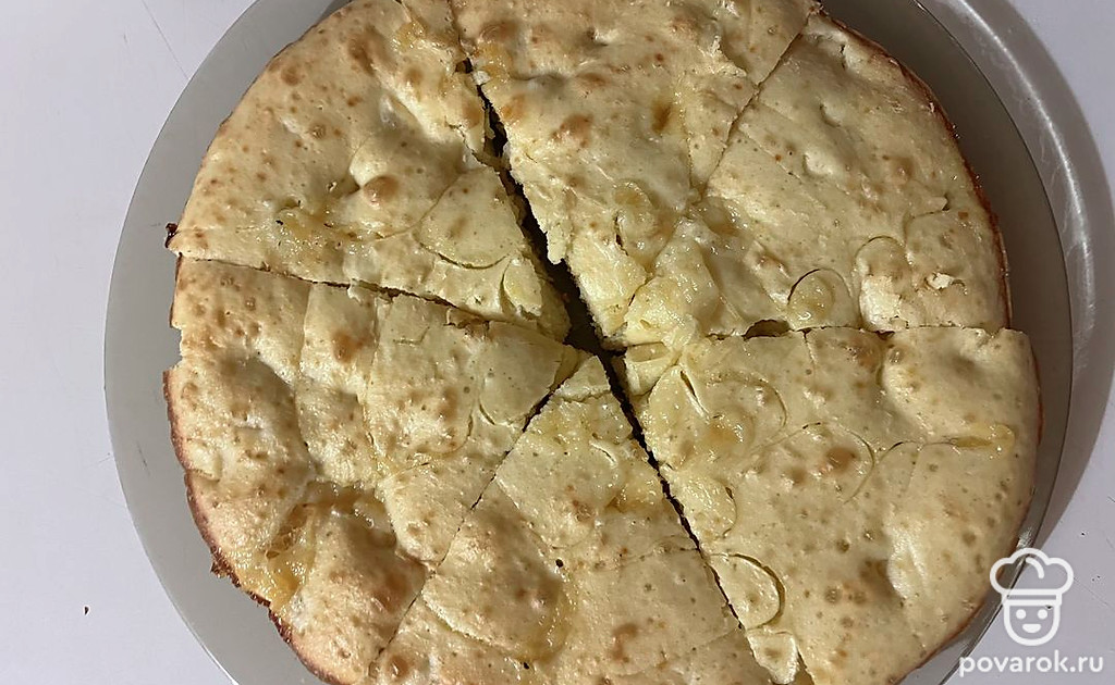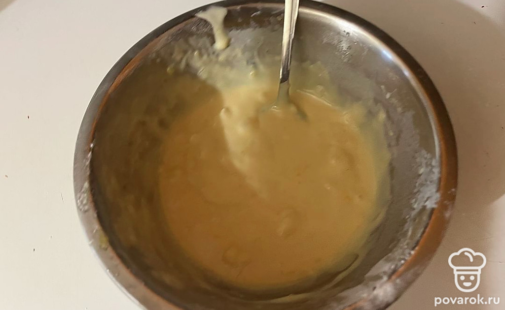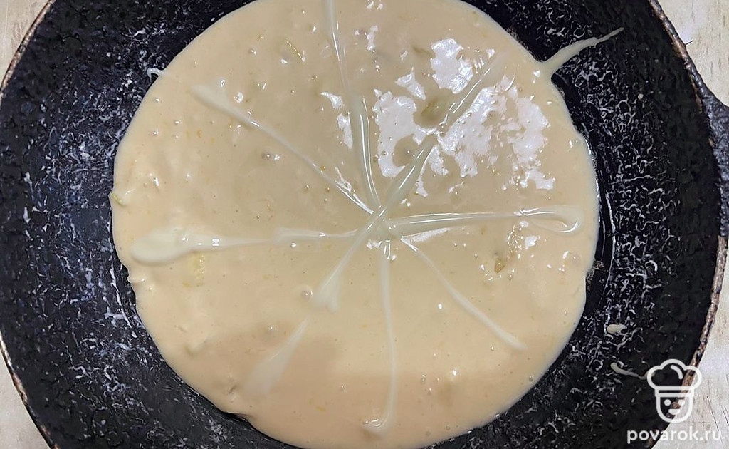 Далее в форму влейте тесто и, при помощи чайной ложке, поверх теста нанесите сгущенное молоко как показано на фото.