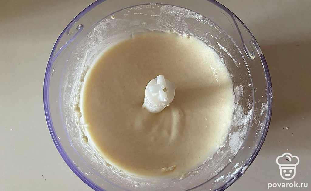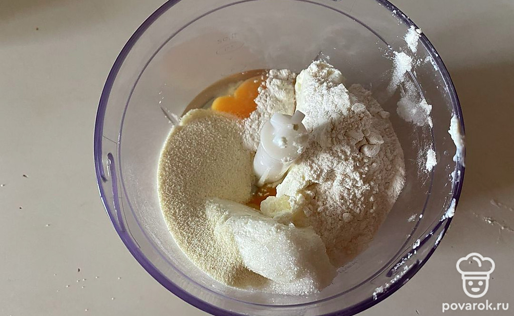 В чаше блендера соедините сахар, яйца, творог, манную крупу и муку.