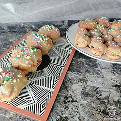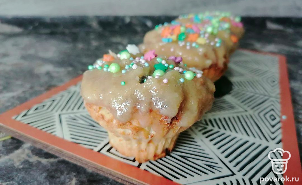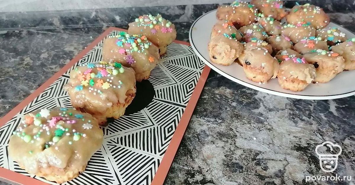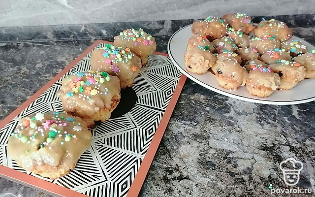 Выпечка готовится с добавлением творога и получается очень мягкой внутри и с хрустящей корочкой снаружи, с легким творожным послевкусием. А помадка очень деликатно подслащивает куличики, делая их очень вкусным пасхальным лакомством!