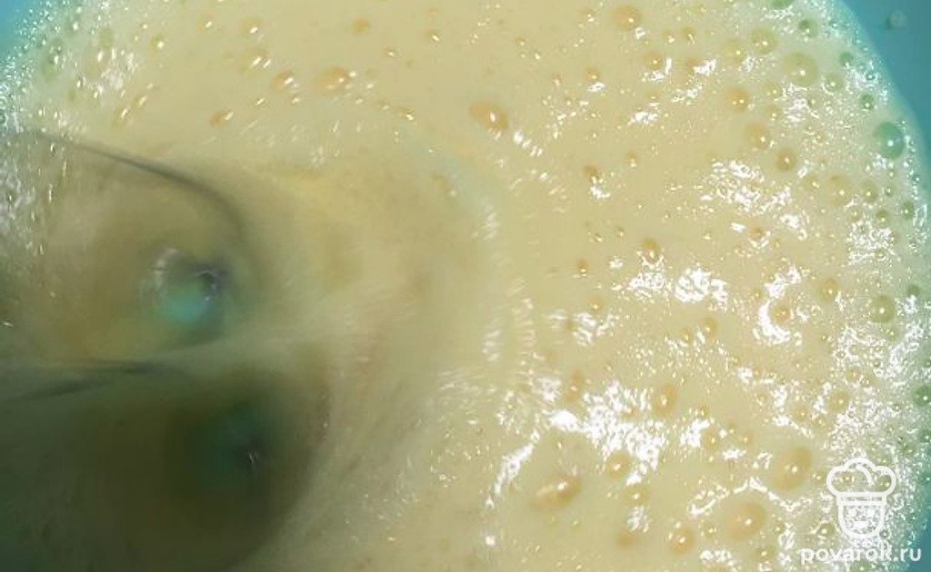 В муку высыпаем разрыхлитель и все просеиваем в яичную смесь, аккуратно перемешиваем, чтобы тесто не потеряло пышность.