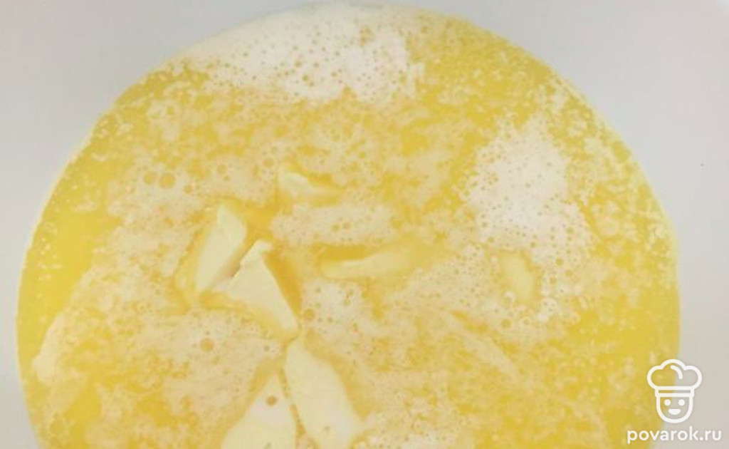 Берём эмалированную чашу или ковшик, наливаем молоко, кладём масло сливочное и ставим на огонь, чтобы масло растаяло, но не кипело, до первых пузырьков, и выключаем газ.