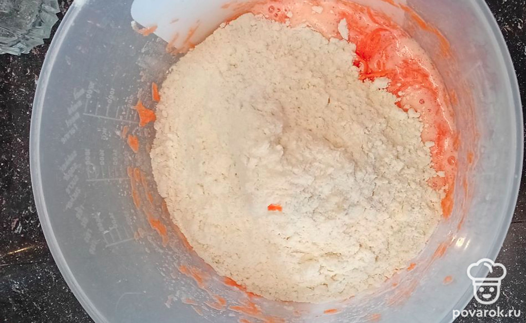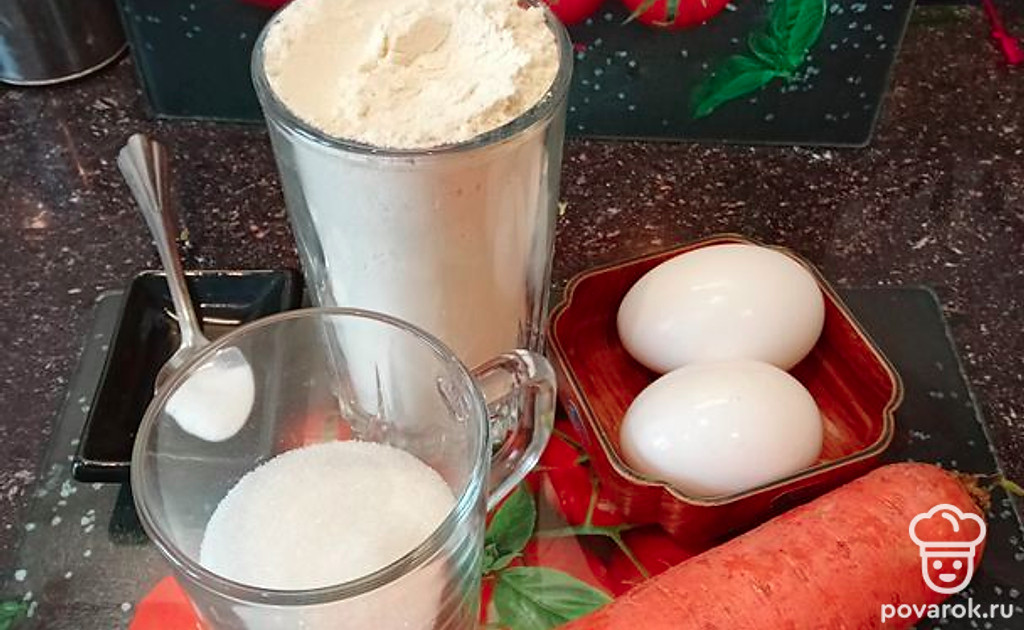 Муку просеять. Морковь почистить и натереть на мелкой тёрке.